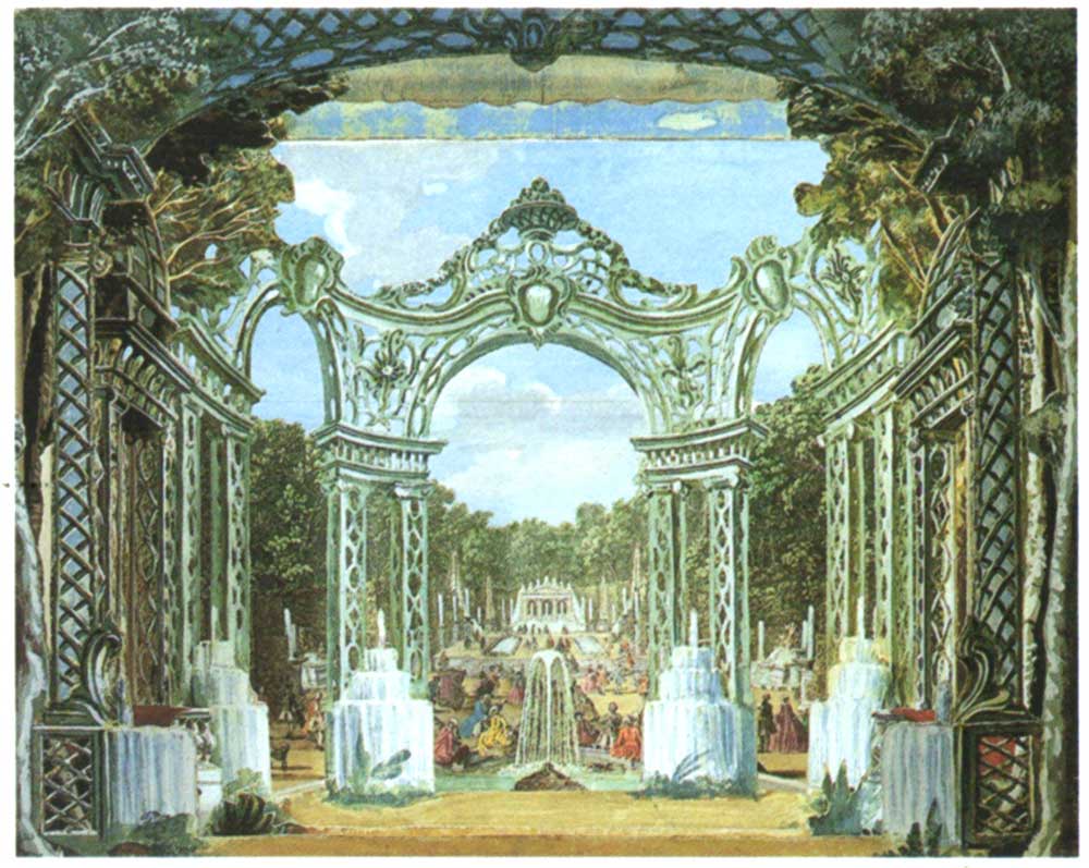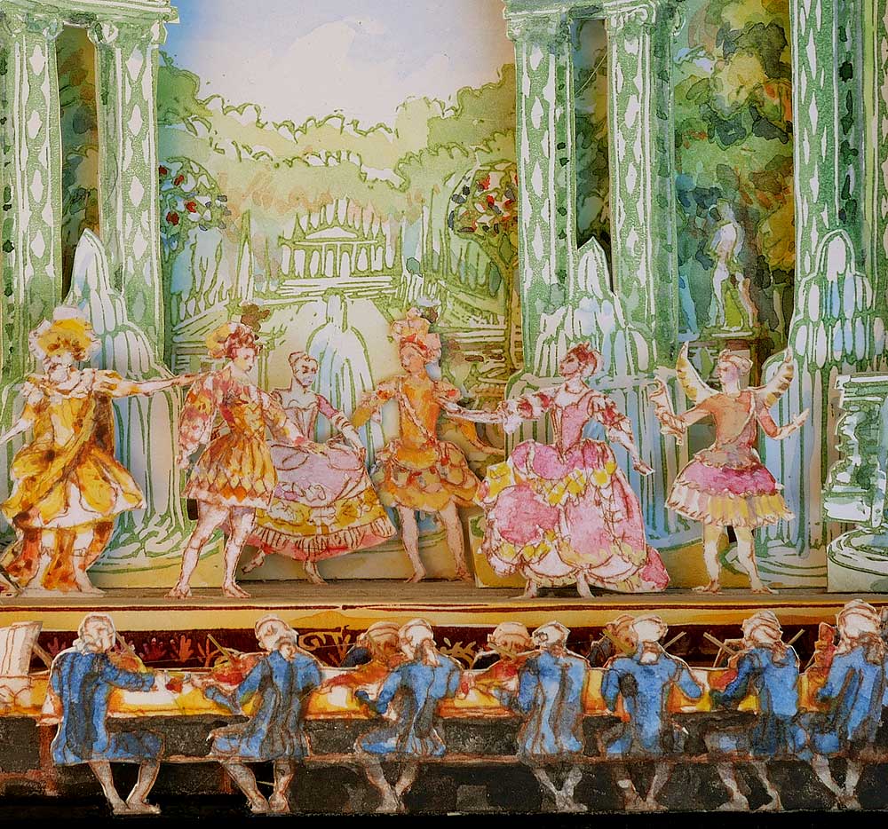 A detail of the 18th century paper theatre. It is based on the works of several artists, but mainly Algieri, Berain and Bibiena