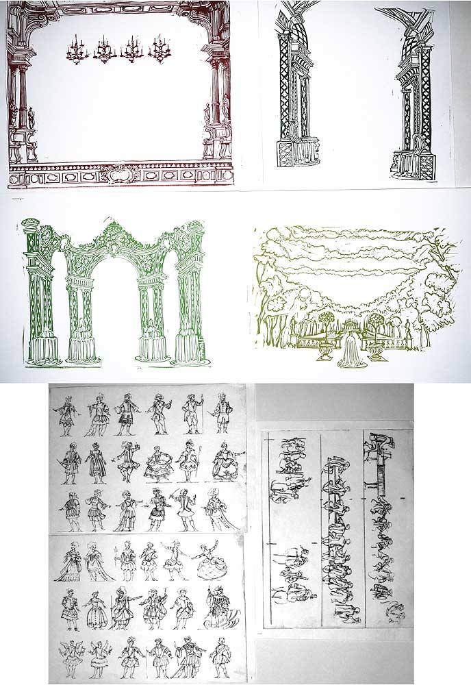 There are 4 lino-block printed sheets for the proscenium arch and scenery and several dry-point (intaglio) sheets of actors and the orchestra, in my re-working of the period.