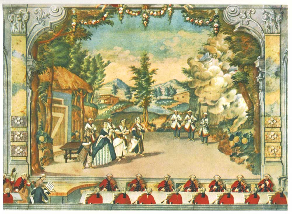 A performance, possibly by Haydn, at Eszterhaza, showing a common layout of the orchestra, with the strings on either side of a long, double sided desk.